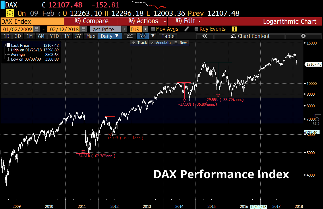 So hat es im DAX seit 2009 sogar vier Phasen mit dick zweistelligen Rücksetzern gegeben – den schlimmsten im Sommer 2011 (-34%), aber auch die zehn Monate von April 2015 bis Februar 2016 waren mit knapp 30% Minus nicht von schlechten Eltern.