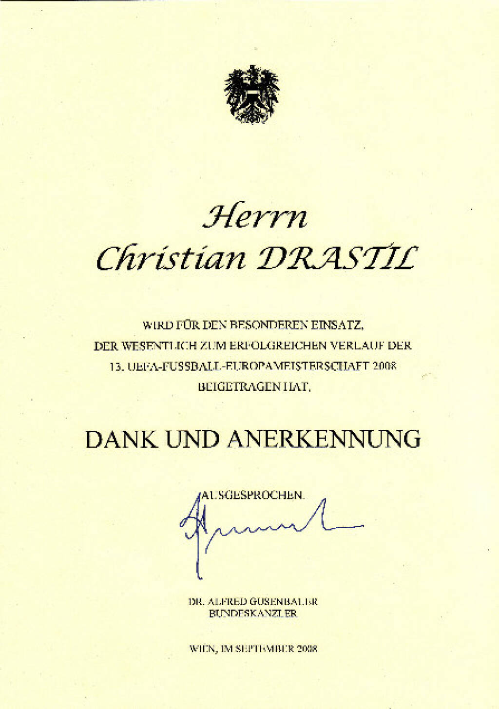 Dank und Anerkennung Christian Drastil durch Alfred Gusenbauer.