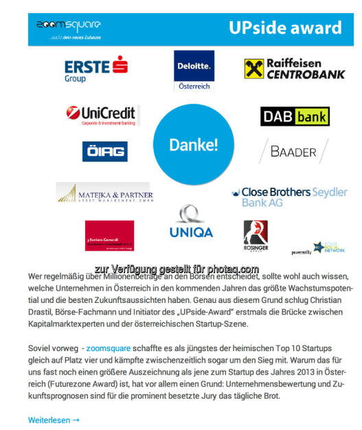 zoomsquare schreibt: "Wer regelmäßig über Millionenbeträge an den Börsen entscheidet, sollte wohl auch wissen, welche Unternehmen in Österreich in den kommenden Jahren das größte Wachstumspotential und die besten Zukunftsaussichten haben. Genau aus diesem Grund schlug Christian Drastil, Börse-Fachmann und Initiator des „UPside-Award“ erstmals die Brücke zwischen Kapitalmarktexperten und der österreichischen Startup-Szene.