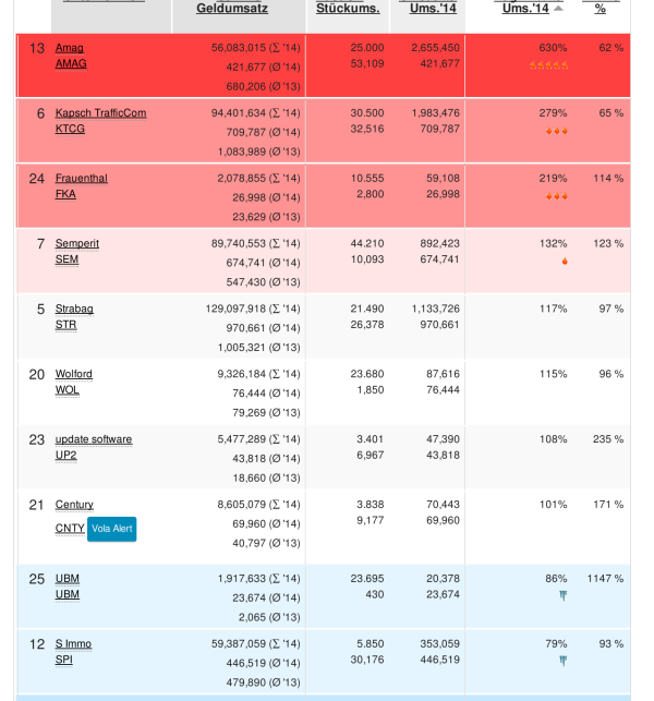 Amag: Letzter Schlusskurs (Euro): 25.000, das ist der 65. beste von 133 Handelstagen (%-Perf.) , das ist der 3. beste von 133 Handelstagen (Preis) , Periodenhoch am 23.04.14 (Kurs: 25.100 Δ% -0.4), Periodentief am 30.12.13 (Kurs: 21.680 Δ% 15.31), 133 Handelstage, davon ↑ 64 → 8 ↓ 61 , Performance Periode: 15.31 %, Umsatz '14/'13: 62 %