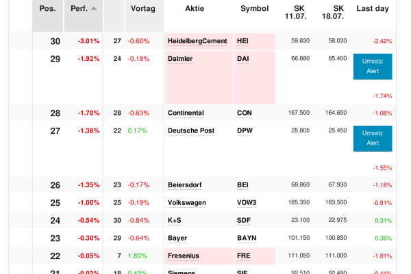 HeidelbergCement, Daimler, Continental, Deutsche Post, Beiersdorf, Volkswagen, K+S, Bayer, Fresenius und Siemens waren in der abgelaufenen Wochen die Verlierer-Titel des DAX.