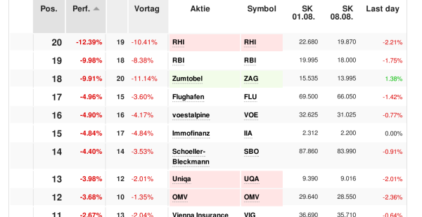 Weitere Wochenverlierer im ATX: RBI, Zumtobel, Flughafen, voestalpine, Immofinanz, Schoeller-Bleckmann, Uniqa, OMV, Vienna Insurance Group: