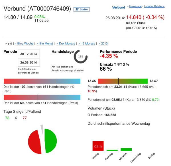 Verbund: Letzter Schlusskurs (Euro): 14.840, das ist der 103. beste von 161 Handelstagen (%-Perf.) , das ist der 69. beste von 161 Handelstagen (Preis) , Periodenhoch am 23.01.14 (Kurs: 16.665 Δ% -10.95), Periodentief am 08.05.14 (Kurs: 13.650 Δ% 8.72), 161 Handelstage, davon ↑ 78 → 6 ↓ 77 , Performance Periode: -4.35 %, Umsatz '14/'13: 66 %