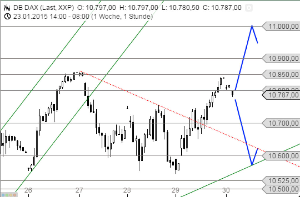 Unterhalb der kurzfristig etablierten Abwärtstrendlinie schien es, als wolle der Dax am Donnerstag seine Konsolidierung weiter fortsetzen. Doch noch am Vormittag nahm der Kaufdruck zu und eine Attacke auf die Abwärtstrendlinie erfolgte. Im ersten Anlauf zwar gescheitert, umso beeindruckender vollzog der Index am Nachmittag den Ausbruch darüber mitsamt klarer Überwindung der Marke von 10.700 Punkten. Aufgrund starker US-Börsen konnten die Gewinne im außerbörslichen Handel weiter ausgebaut werden.