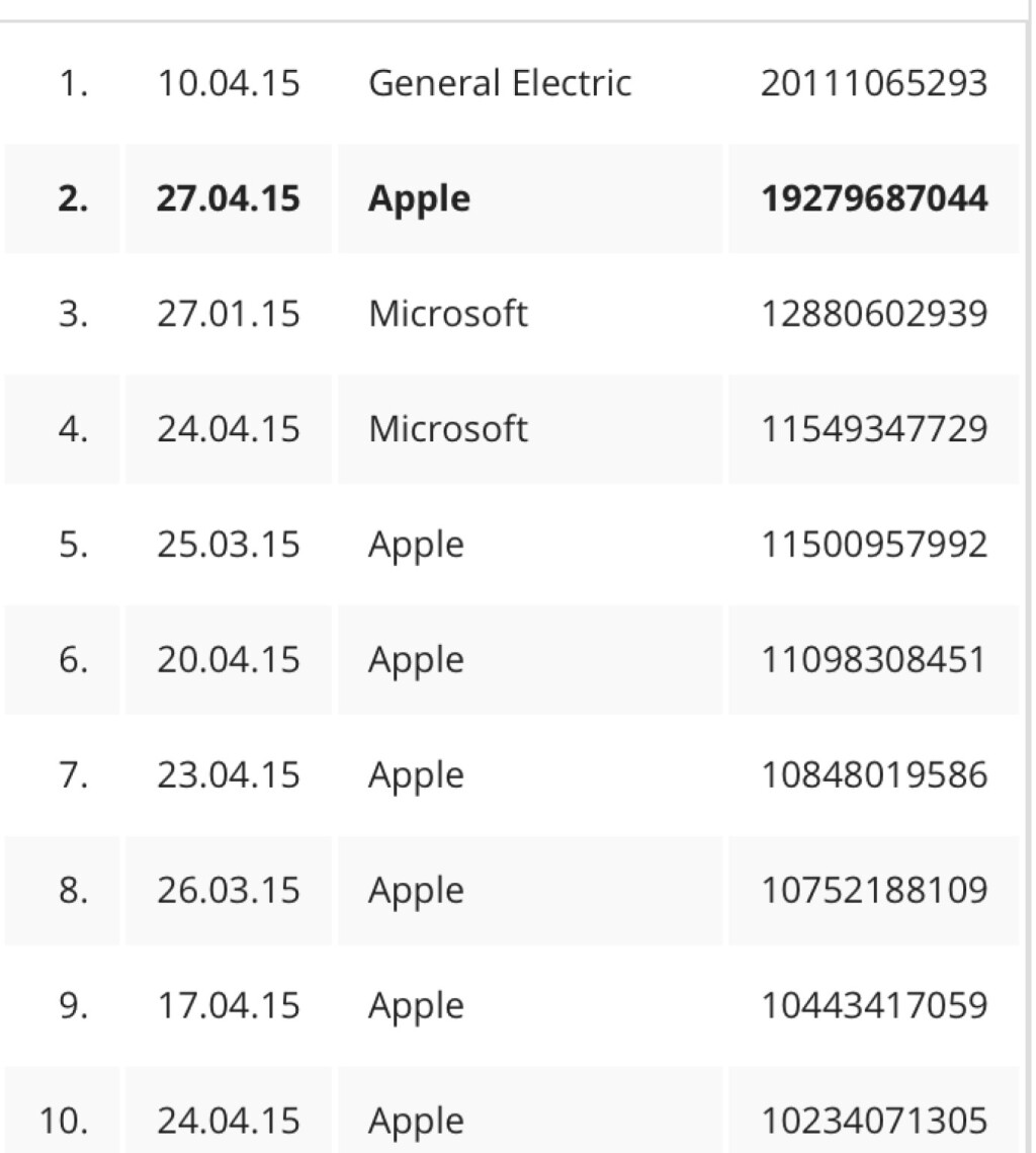 Apple hat sich im Ranking der höchsten Dow-Tagesumsätze gestern an GE angeschlichen. Nun 7x Apple unter den Top10.