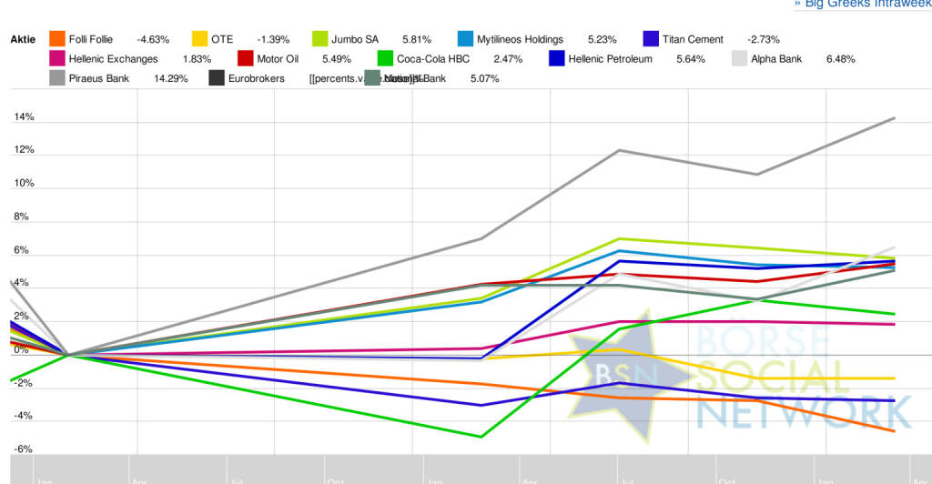 In der Monatssicht ist vorne: Piraeus Bank 97,41% vor Alpha Bank 54,76% , Hellenic Petroleum 28,22% , National Bank 25% , Motor Oil 19,64% , Mytilineos Holdings 17,74% , OTE 14,86% , Hellenic Exchanges 13,03% , Coca-Cola HBC 9,03% , Folli Follie 5,53% , Jumbo SA 5,42% , Titan Cement -4,2% und Eurobrokers -18,18% .