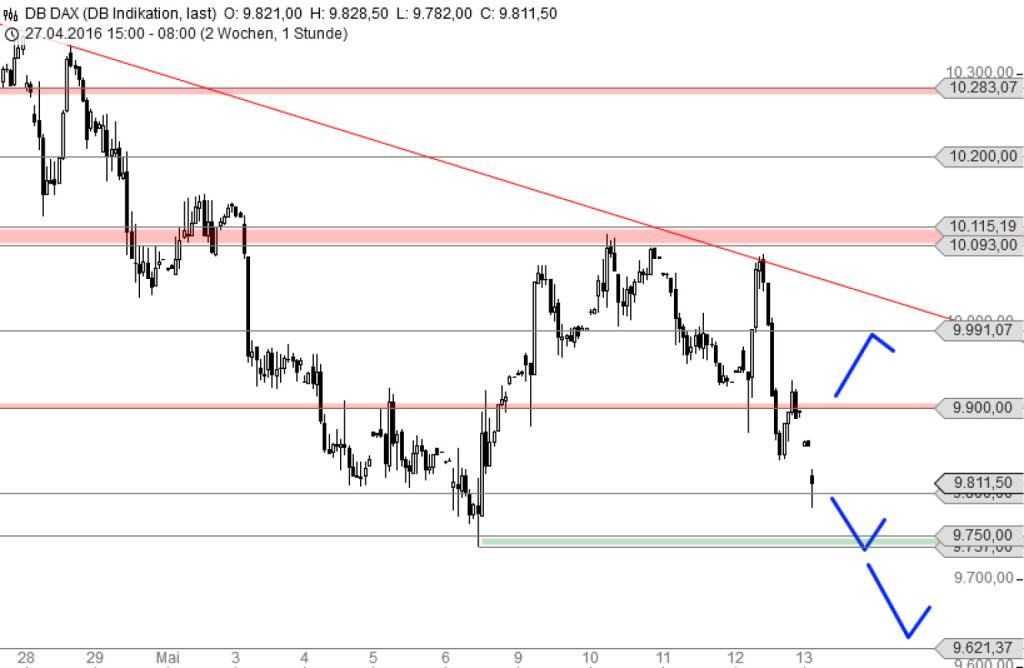 Der gestrige Handel im DAX war von einer steilen Berg- und Talfahrt geprägt. Zuerst konnte der Index in einer weiteren Aufwärtsbewegung von der Unterstützung bei 9.900 Punkten bis an den Widerstandsbereich bei 10.093 Punkten klettern. Dort schlugen die Bären allerdings mit aller Macht zu und sorgten für einen steilen Ausverkauf, der den DAX bis weit unter die 9.900 Punkte-Marke drückte. Dieser Kurseinbruch setzt sich heute in der Vorbörse fort.