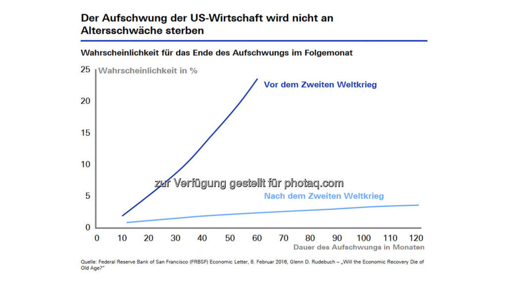 Das bringt mich zu einer anderen Annahme. Der Bullenmarkt, die Phase mit steigenden Kursen dauert schon sehr lange an und müsste doch mal beendet sein. Im Prinzip steigen die Aktienkurse schon seit dem Jahr 2012. Doch innerhalb eines primären Aufwärtstrends sind zyklische, meist kurzlebige Bärenmärkte nichts Ungewöhnliches. Als kurzlebige Abwärtsphase definiert Börsenstar Ned Davis Kursrückgänge von wenigstens 30 Prozent in 50 Kalendertagen oder 13 Prozent in 145 Kalendertagen (siehe Grafik). Und auch die Wirtschaftsdaten deuten auf einen langanhaltenden Aufschwung hin. Damit müsste doch nun eigentlich bald Schluss sein, könnte man denken. Allerdings steigt die Wahrscheinlichkeit mit der Dauer des Aufschwungs kaum, wie eine zweite Grafik aus einer Präsentation des Bankhauses Metzler bezüglich der US-Wirtschaft zeigt.