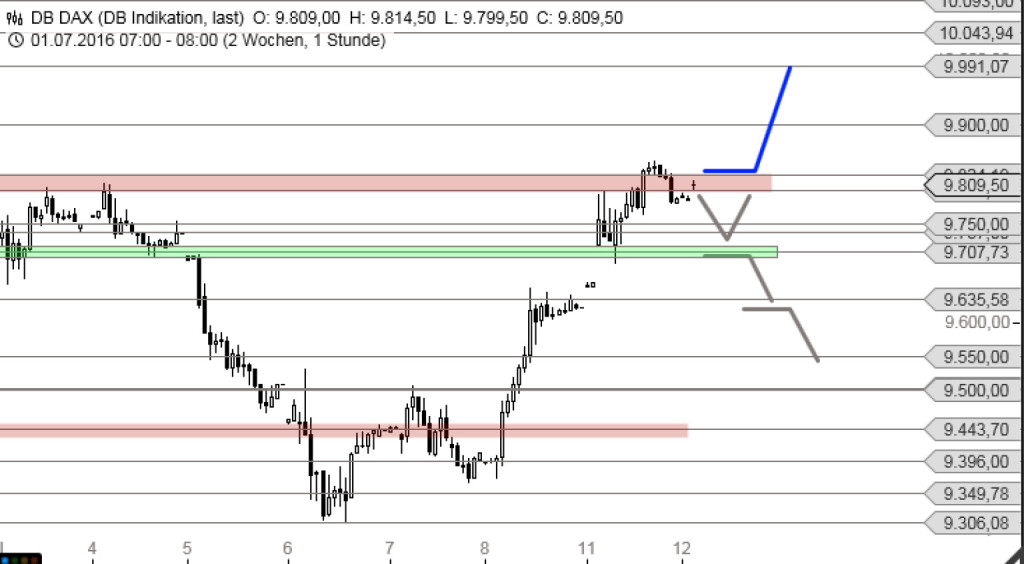 Vorbörslich kämpft der Deutsche Aktienindex um die 9.800-Punkte-Marke. Ein Stundenschlusskurs über das alte Widerstandsband bei 9.824 Punkten dürfte für einen weiteren Kursaufschwung sorgen. Doch zuvor könnte der DAX noch einmal auf 9.750 Punkte zurückfallen. Von diesem Kursniveau könnte dann die nächste Aufwärtswelle starten. Oberhalb von 9.824 Punkten hat dann der Index die Chance direkt auf 9.991 Punkte anzusteigen.. Würde der Deutsche Leitindex allerdings unter die 9.700 Punkte-Marke zurückfallen, müsste man mit einem Gap-Close bei rund 9.630 Punkten rechnen. Ein Unterschreiten der 9.630 Punkte-Marke würde ein Rückgang bis 9.550 Punkten ermöglichen.