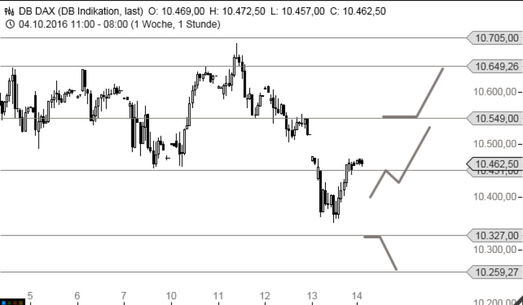 Durch dieses Reversal haben die Bullen am heutigen Tag einen kleinen Vorteil erarbeitet. Nach Rücksetzern, die oberhalb des gestrigen Tiefs enden, könnte sich eine zweite Erholungswelle bis ca. 10.550 Punkten ergeben. Sollte dieser Anstieg Erfolg haben, dann wäre die gestrige Kurslücke geschlossen. Für eine weitreichendere Bewegung müsste der Deutsche Aktienindex allerdings über 10.550 Punkte schließen. Ein neues Verkaufssignal würde unterhalb von 10.327 Punkten warten. Anschließend wäre ein Rückfall bis 10.259 Punkte möglich.