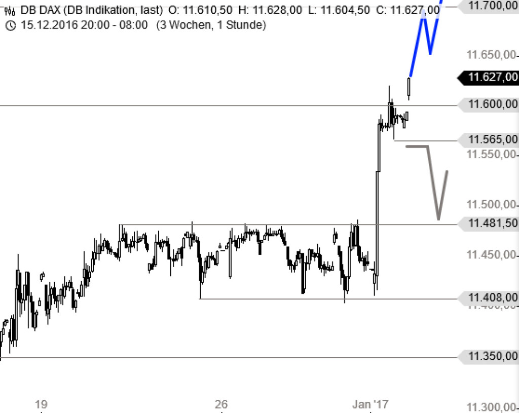 Der DAX eröffnete vorbörslich zwar etwas schwächer und näherte sich der unteren Begrenzung der Seitwärtsbewegung der letzten Tage bei 11.408 Punkten an, drehte aber dann sofort stark nach oben. Er durchbrach zügig den Widerstand bei 11.480 Punkten und setzte den Tag über die Aufwärtsbewegung fort. Am Nachmittag erreichte er ein Tageshoch bei 11.619 Punkten. Anschließend konsolidierte er leicht. Die heutige Eröffnung des vorbörslichen Handels deutet auf einen Ausbruch aus dieser kleinen Konsolidierung hin. Denn der DAX notiert ganz zu Handelsbeginn minimal über dem gestrigen Tageshoch.