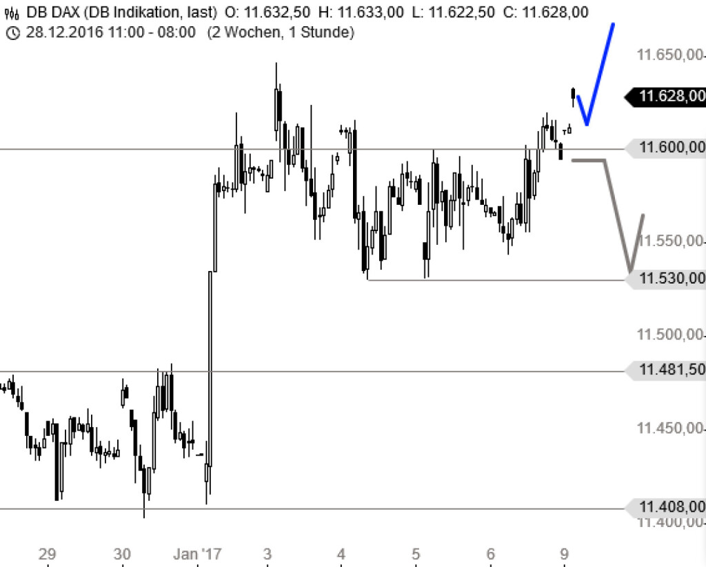 Der DAX hat heute die Chance, die Rally der letzten Tage fortzusetzen und einen weiteren Schritt hin zum nächsten großen Ziel bei 11.802 Punkten zu gehen. Ein Rückfall unter 11.600 Punkte wäre allerdings ein negatives Zeichen und würde Abgaben in Richtung 11.530 Punkte implizieren.