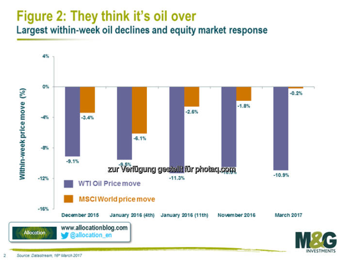 Juan Nevado, Fondsmanager im Multi-Asset-Team bei M&G Investments (Foto anbei), beobachtet zurzeit eine gewisse Apathie an den Finanzmärkten. „Anfang 2016 war eher das Gegenteil der Fall. Die Korrelation zwischen der Ölpreisentwicklung und Finanzanlagen war so hoch, dass man vom Preisverlauf bei Öl direkt auf den Tagestrend bei Aktien und Anleihen schließen konnte“, sagt der Experte. Zuletzt reagierten die Märkte jedoch kaum noch auf die niedrigeren Energiekosten (siehe Grafik). Aus Nevados Sicht illustriert dies beispielhaft, wie einzelne Themen phasenweise die volle Aufmerksamkeit der Marktteilnehmer auf sich ziehen können – um dann für den nächsten Trend fallengelassen zu werden.