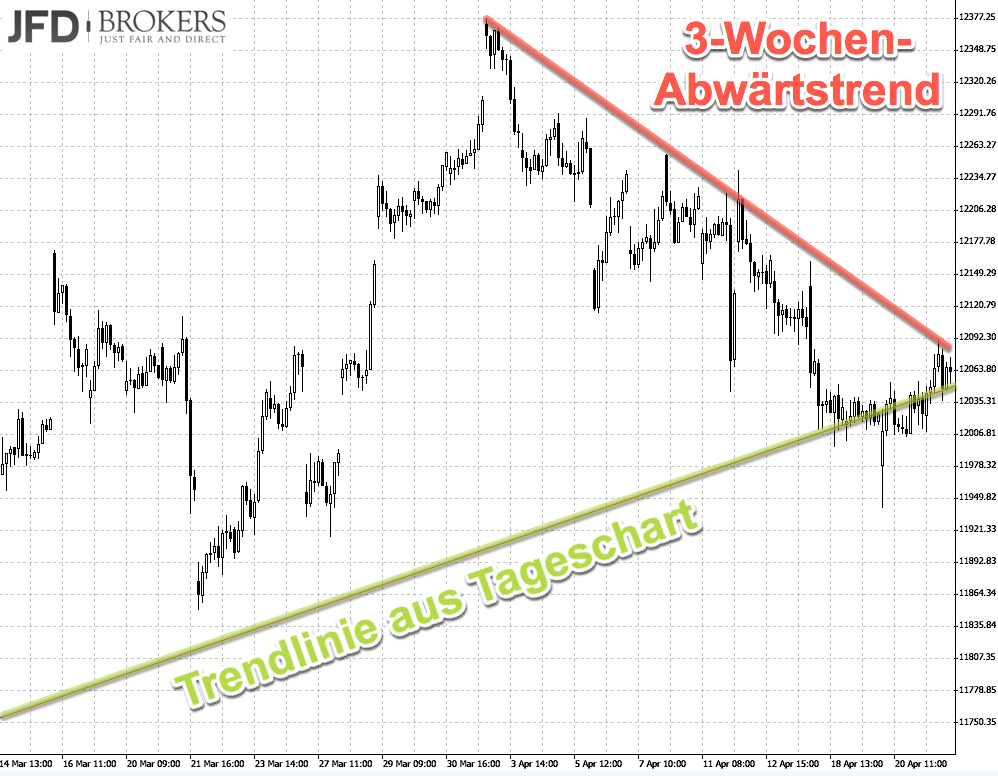 Per XETRA-Schluss wurde übrigens die 12.000 am Dienstag punktgenau gerettet! Somit versuchte der DAX am Mittwoch, diese Bewegung nachzuvollziehen. Zumindest zur Handelseröffnung, denn danach verließen ihn die Kräfte wieder. Auf der Unterseite trat nun das GAP aus Ende März in den Fokus: