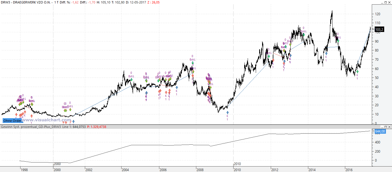 Im langfristigen Chart erkennt man die massive Dynamik seit dem Tief im Jahre 2009. Das Unternehmen konnte sich in 6 Jahren fast verzehnfachen. Was für eine Entwicklung. Aktuell sieht es so aus, als könnte die Drägerwerk AG erneut zu dem Allzeithoch vordringen und dieses testen.
