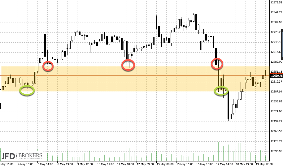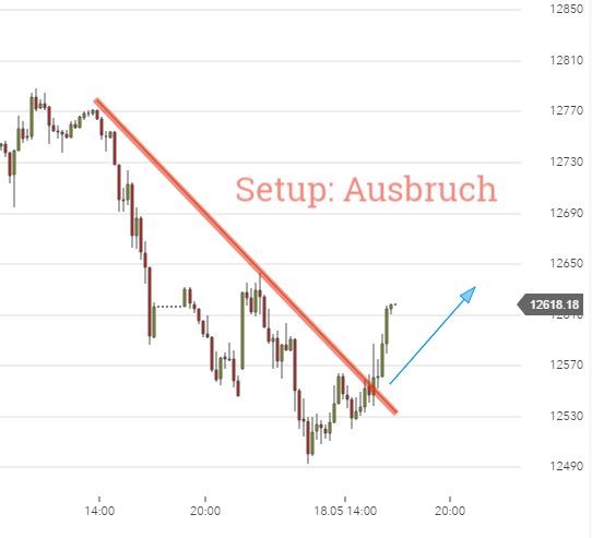 Basierend auf dieser Einstellung ist ein Ausbruch für mich ein jeweils prozyklisches Signal. Konkret: Kurse über 12.650 sind ein Long-Signal und Kurse unter 12.587 (Tiefpunkt von Mittwoch) das entsprechende Short-Signal. Im Chart verortet sehen diese beiden Trigger wie folgt aus: