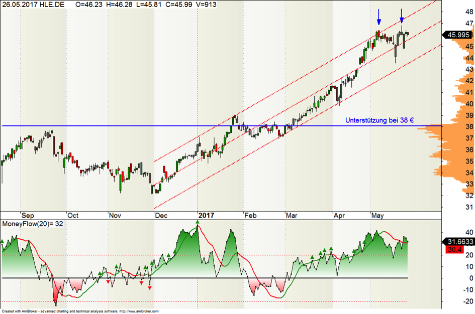 Am 08.05.17 und am 23.5.17 gab es von fünf Personen des Vorstandes Verkäufe der Hella-Aktien. Wie man am oberen Chart erkennen kann, befindet sich die Aktie in einem Aufwärtstrend. Mit den Verkäufen ist allerdings zu vermuten, dass die Geschäftsleitung den Aktienkurs für zu hoch hält.