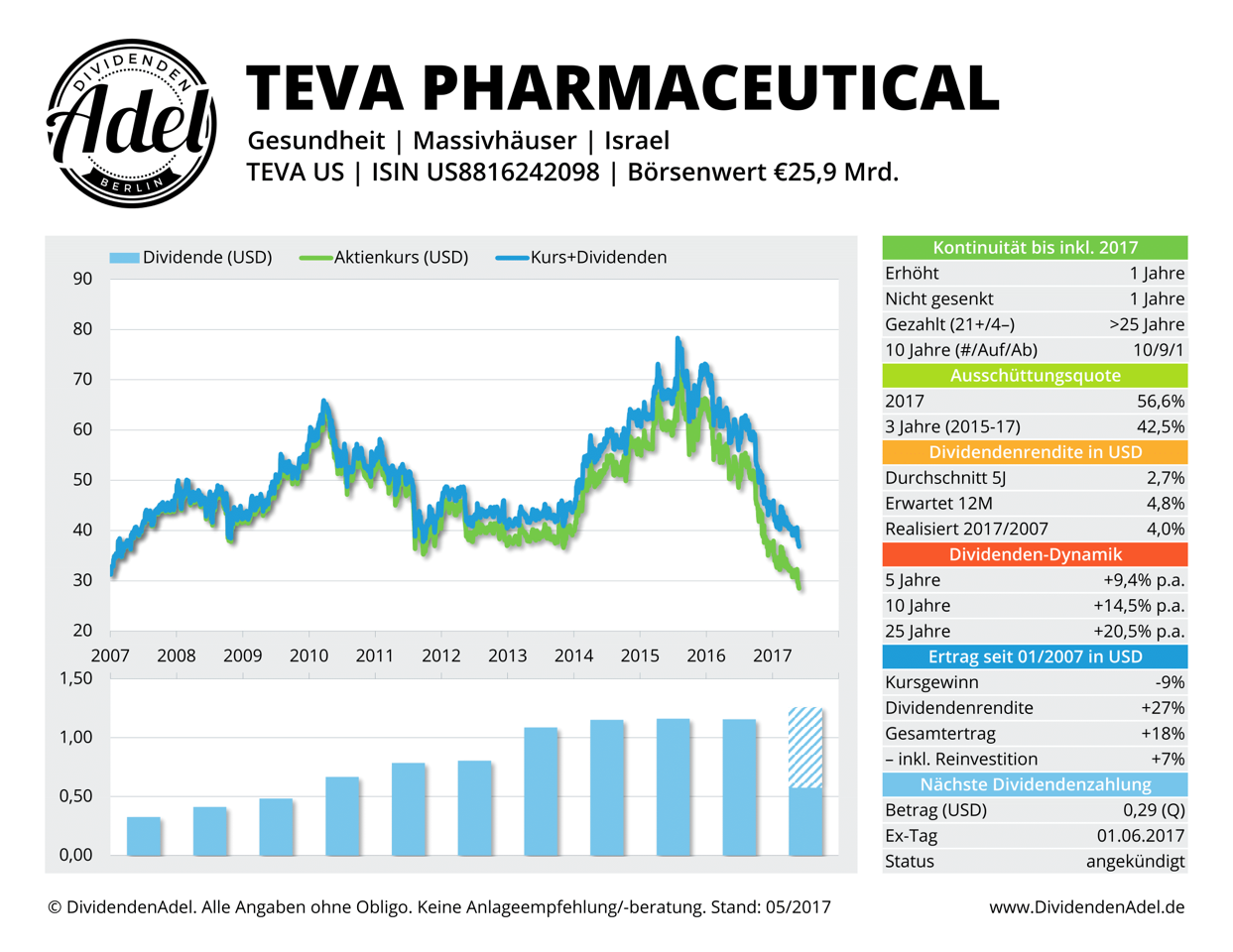 Payout-Quote im DividendenAdel-Korridor (was bei Pharmawerten ja keine Selbstverständlichkeit ist), nachhaltiges Wachstum und abgesehen vom einem marginalen Wackler 2016 seit über zehn Jahren keine Kürzung – das sieht eigentlich gar nicht so schlecht aus. Doch die mit 4,8% überaus üppige Rendite zeigt schon an, dass etwas im Busch ist. Und in der Tat kommt ein Engagement bei Teva derzeit dem viel beschworenen Griff ins fallende Messer nahe: Das Geschäft mit Medikamenten gegen Multiple Sklerose (Copaxone) ist für den Generika-Hersteller, der in Deutschland mit der Marke ratiopharm vertreten ist, eine deutlich größere Herausforderung als gedacht. Das einzige, was der Aktie zügig auf die Beine helfen würde, wäre eine Fokussierung auf’s Kerngeschäft. Danach sieht es aber nicht aus und deshalb ist Teva b.a.w. nicht mehr als eine richtig heiße Turnaround-Wette.
