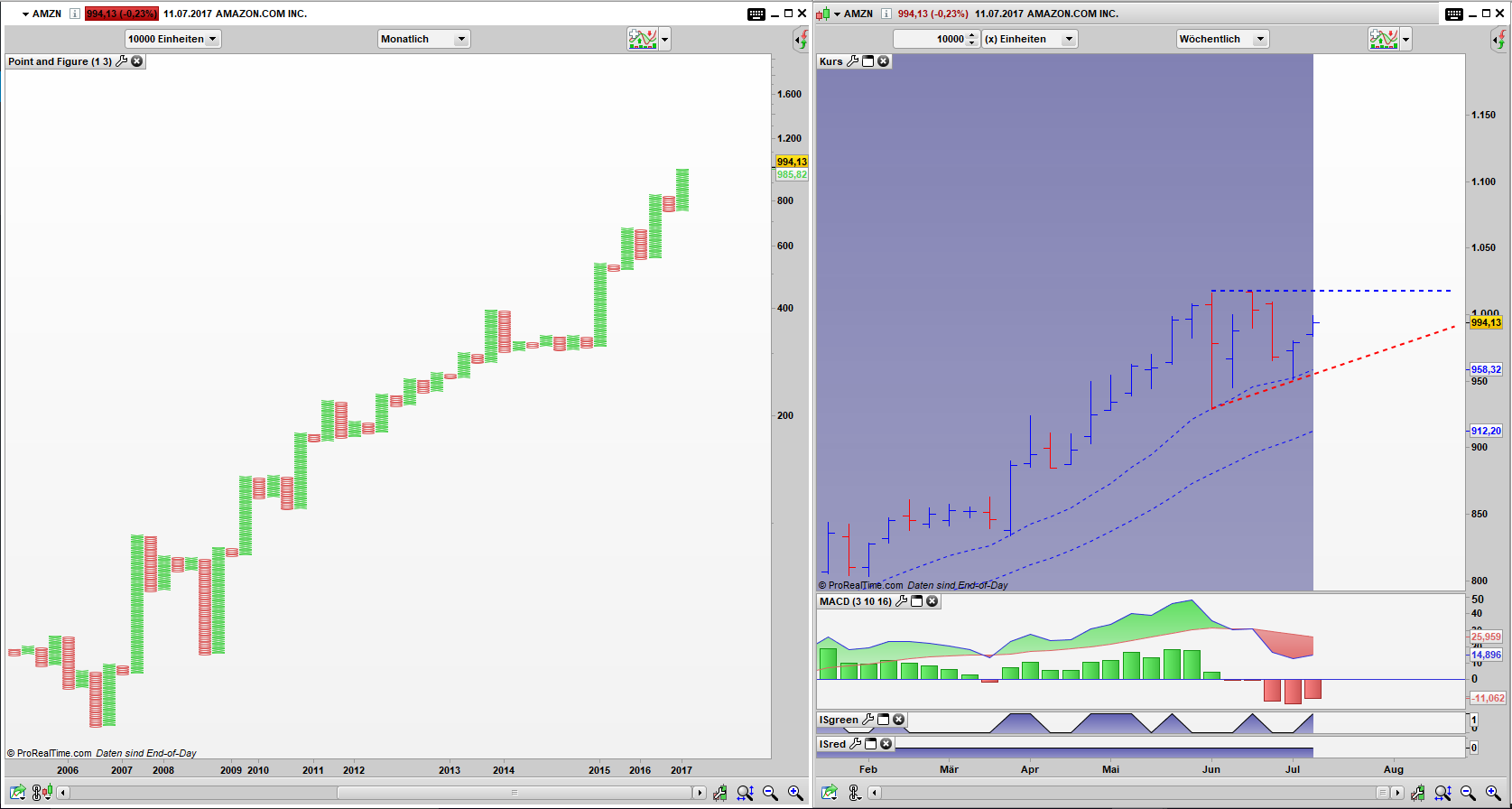 Auch hier bei Amazon (WKN: 906866 / ISIN: US0231351067) stehen die Bullen im Point and Figure Chart fest am Ruder und der Bar Wochen Chart sieht auch nicht schlecht aus. Nicht nur, dass sich die Aktie von der Value Zone abstoßen konnte erfreut die Bullen sondern auch die Formation die gerade gebaut wird. Im Moment baut der Markt hier an einem Dreieck, was im klassischen Fall eine Fortsetzungsformation darstellt.