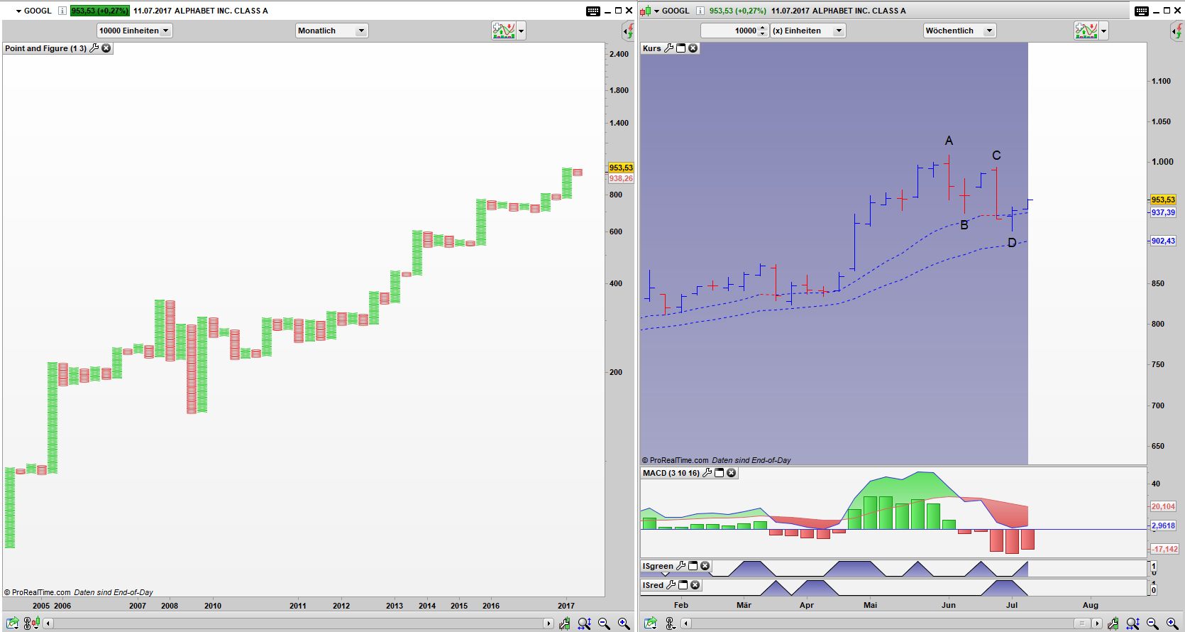 Bei Google (WKN: A14Y6H / ISIN: US02079K1079) sind die Bullen unangefochten an der Spitze und ein Ende ist im PaF Chart noch nicht ersichtlich. Der Wochen Chart gleicht fast dem von Netflix, nur dass hier ein ABCD Pattern vorliegt bei dem a = c ist. Die Value Zone konnte die Korrektur beenden und im Anschluss entstand ein Umkehrstab, der in dieser Woche aktiviert wurde.