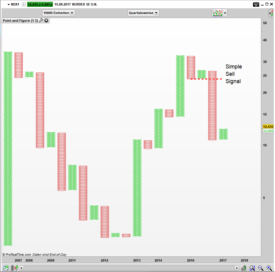 Diese Umstände schlagen sich im Moment auch im Kurs von Nordex wieder, deren Aktienkurs seit der Finanzkrise ein Dreieck geformt hat. Hier befindet sich die Aktie im Moment in der Mitte des Dreiecks, nachdem sie seit Januar 2016 gefallen ist.