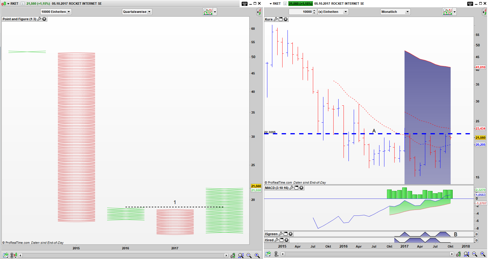 Um den von den Samwer Brüdern gegründete Internetinkubator Rocket Internet (WKN: A12UKK / ISIN: DE000A12UKK6) ist es in letzter Zeit ruhiger geworden, was aber nichts schlechtes bedeuten muss. Seit dem IPO im Jahr 2014 verlor die Aktie mehr als 50% an Wert, doch konnte sie sich seit Mitte 2016 stabilisieren. Für die arg gebeutelten Aktionäre keimt Hoffnung auf, denn im Mai diesen Jahres wurde im Point and Figure Chart ein Kaufsignal generiert. Ob sich dieses durchsetzen wird hängt jetzt an einer wichtigen Marke im Bar Chart.