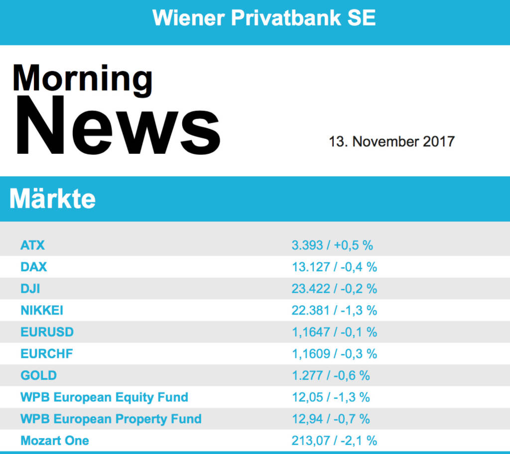 Gegen den europäischen Trend stemmte sich der ATX und schloss 0,5% höher. Impulse kamen unter anderem vom 0,8 % gestiegenen BIP im dritten Quartal. Stark waren die Bankenwerte, Raiffeisen legte 1,5% zu, Erste Group schloss 0,9% höher und auch die BAWAG verzeichnete ein Plus von 1,3%. Die Baader Bank erwartet starke Zahlen von Lenzing, der Faserhersteller konnte 0,9% zulegen. OMV gewann nach einer Kurszielerhöhung durch Credit Suisse 0,7%, Wienerberger hingegen musste nach einer Verringerung des Ausblicks durch Berenberg 0,9% abgeben. Unverändert sieht die Credit Suisse VoestAlpine, Kursziel und Einstufung wurden beibehalten. Der Stahlkonzern beendete den Tag 0,6% schwächer. Die österreichischen Unternehmen berichten ja traditionell etwas später, am Dienstag ist die Raiffeisen an der Reihe, am Mittwoch dann Lenzing und die Österreichische Post und am Donnerstag noch Uniqa.