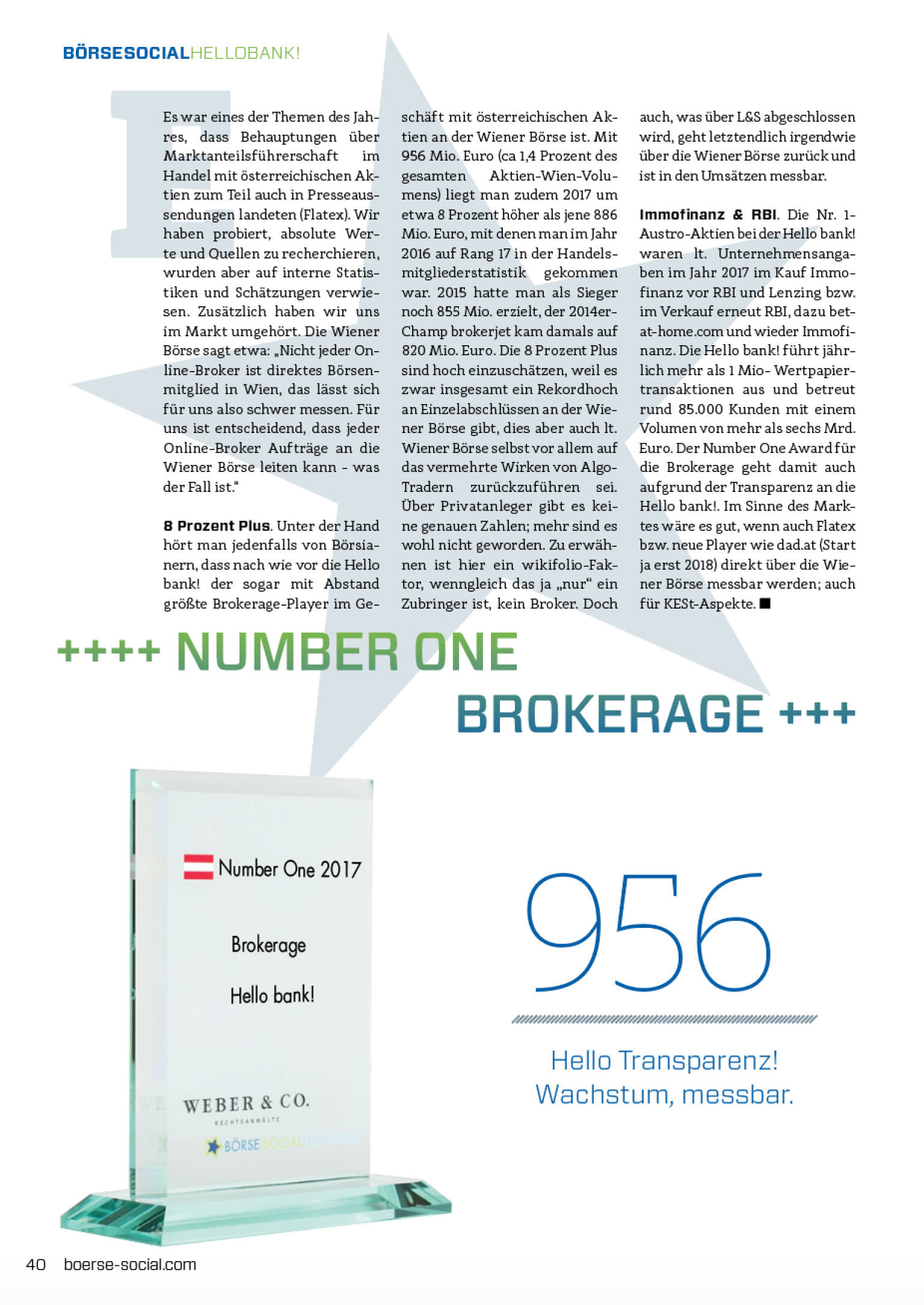 Number One Brokeragehttps://boerse-social.com/numberone/2017Es war eines der Themen des Jahres, dass Behauptungen über Marktanteilsführerschaft im Handel mit österreichischen Aktien zum Teil auch in Presseaussendungen landeten (Flatex). Wir haben probiert, absolute Werte und Quellen zu recherchieren, wurden aber auf interne Statistiken und Schätzungen verwiesen. Zusätzlich haben wir uns im Markt umgehört. Die Wiener Börse sagt etwa: „Nicht jeder Online-Broker ist direktes Börsenmitglied in Wien, das lässt sich für uns also schwer messen. Für uns ist entscheidend, dass jeder Online-Broker Aufträge an die Wiener Börse leiten kann - was der Fall ist.“8 Prozent Plus. Unter der Hand hört man jedenfalls von Börsianern, dass nach wie vor die Hellobank! der sogar mit Abstand größte Brokerage-Player im Geschäft mit österreichischen Aktien an der Wiener Börse ist. Mit 956 Mio. Euro (ca 1,4 Prozent des gesamten Aktien-Wien-Volumens) liegt man zudem 2017 um etwa 8 Prozent höher als jene 886 Mio. Euro, mit denen man im Jahr 2016 auf Rang 17 in der Handelsmitgliederstatistik gekommen war. 2015 hatte man als Sieger noch 855 Mio. erzielt, der 2014er-Champ brokerjet kam damals auf 820 Mio. Euro. Die 8 Prozent Plus sind hoch einzuschätzen, weil es zwar insgesamt ein Rekordhoch an Einzelabschlüssen an der Wiener Börse gibt, dies aber auch lt. Wiener Börse selbst vor allem auf das vermehrte Wirken von Algo- Tradern zurückzuführen sei. Über Privatanleger gibt es keine genauen Zahlen; mehr sind es wohl nicht geworden. Zu erwähnen ist hier ein wikifolio-Faktor, wenngleich das ja „nur“ ein Zubringer ist, kein Broker. Doch auch, was über L&S abgeschlossen wird, geht letztendlich irgendwie über die Wiener Börse zurück und ist in den Umsätzen messbar.Immofinanz & RBI. Die Nr. 1-Austro-Aktien bei der Hello bank! waren lt. Unternehmensangaben im Jahr 2017 im Kauf Immofinanz vor RBI und Lenzing bzw. im Verkauf erneut RBI, dazu bet-at-home.com und wieder Immofinanz. Die Hello bank! führt jährlich mehr als 1 Mio- Wertpapiertransaktionen aus und betreut rund 85.000 Kunden mit einem Volumen von mehr als sechs Mrd. Euro. Der Number One Award für die Brokerage geht damit auch aufgrund der Transparenz an die Hello bank!. Im Sinne des Marktes wäre es gut, wenn auch Flatex bzw. neue Player wie dad.at (2018 ja erste das erste volle Jahr) direkt über die Wiener Börse messbar werden; auch für KESt-Aspekte.Aus dem "Börse Social Magazine #12"-1 Jahr, 12 Augaben, 77 Euro. Ca. 100 Seiten im Monat, ca. 1200 Seiten Print A4