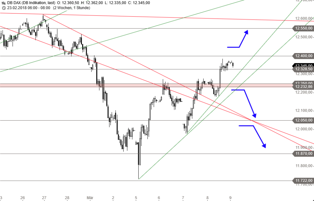 Rückblick: Die Erholung der letzten Tage setzte sich beim DAX auch im gestrigen Handel fort, auch wenn es zunächst zu einer leichten Abwärtskorrektur am Vormittag kam. Doch mit der Rückeroberung der 12.232 Punkte-Marke starteten die Bullen den nächsten Aufwärtsimpuls und trieben den Index über die Hürde bei 12.328 Punkten an den anvisierten Widerstand bei 12.400 Punkten an. Knapp unter der Marke ging der Index aus dem Handel und korrigiert vorbörslich an die 12.328 Punkte-Marke zurück.