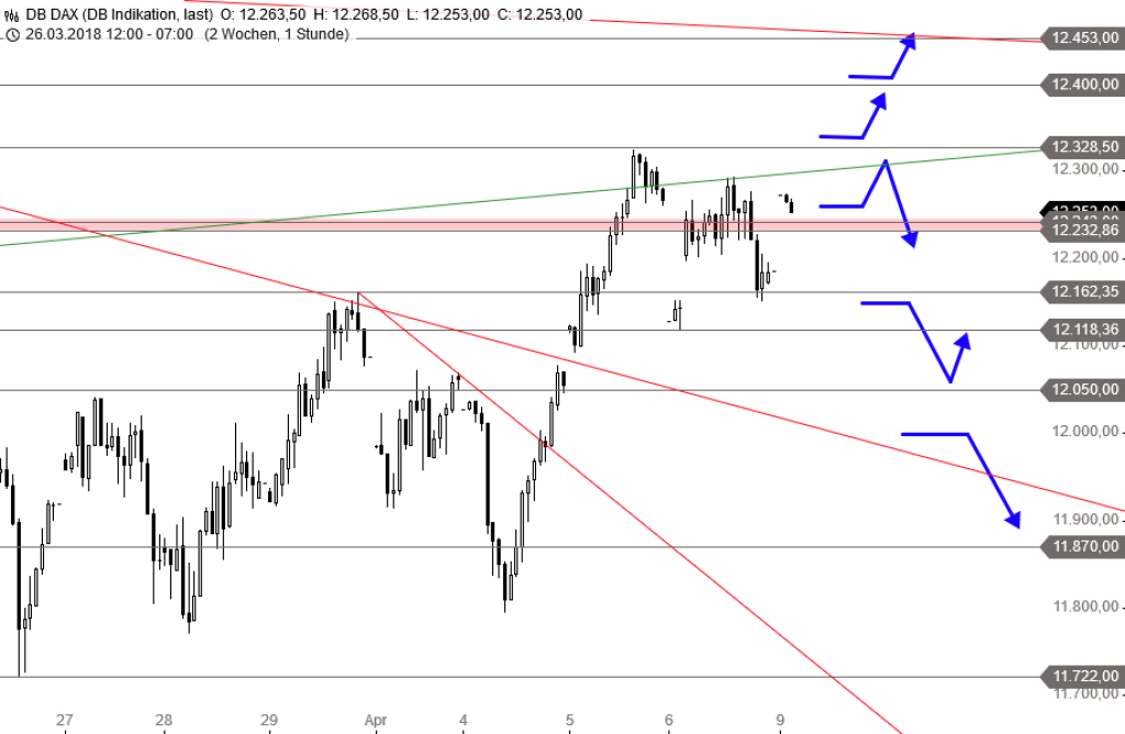 Rückblick: Am vergangenen Freitag kam es in der Vorbörse noch zu deutlichen Abgaben beim DAX , die aber zu Handelsbeginn zunächst keine Rolle spielten und nach einer Eröffnung im Bereich der Hürde bei 12.232 Punkten zunächst auch abgehakt schienen. Selbst der schwache Handelsverlauf in den USA konnte den DAX zunächst nicht in seiner Seitwärtstendenz erschüttern. Erst im nachbörslichen Handel kam es zu einer deutlicheren Verkaufswelle, die den Index wieder unter 12.232 Punkte einbrechen ließ. Bislang bleibt die relative Stärke des deutschen Leitindex gegenüber seinen US-Pendants jedoch bemerkenswert und wird auch durch das für den heutigen Tag zu erwartende Aufwärtsgap unterstrichen.