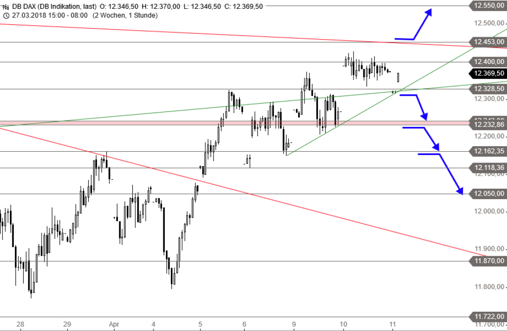 Rückblick: Im gestrigen Handel sprang der DAX mit einem Gap ausgehend von der Unterstützung bei 12.232 Punkten über die Hürde bei 12.328 Punkten und konnte kurzzeitig bereits die 12.400 Punkte-Marke überwinden. Doch nach dem bullischen Auftakt schwanden den Käufern etwas die Kräfte und der Index setzte an die Unterstützung bei 12.328 Punkten zurück. Dort startete ein weiterer Ausbruchsversuch über das Tageshoch, der ebenfalls scheiterte. Damit dürfte es heute zunächst zu einem Test der Unterstützungen auf der Unterseite kommen.