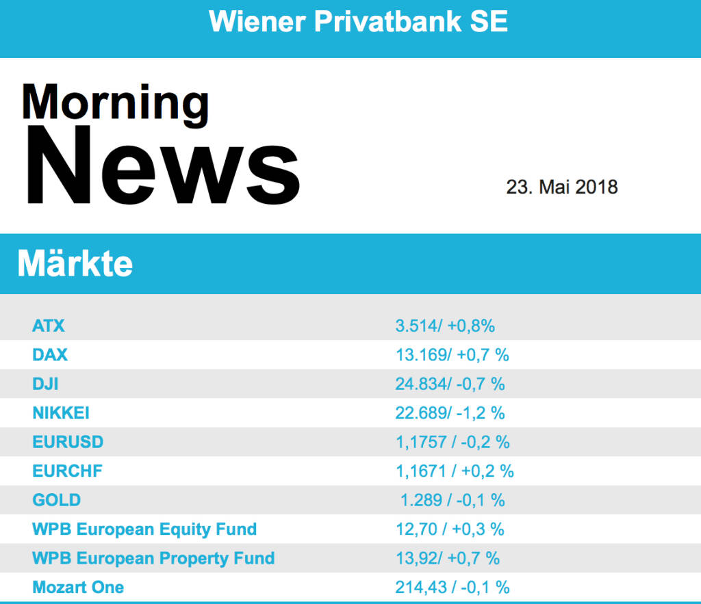 Nach einem verhaltenen Start ging es am Nachmittag deutlicher nach oben. Etwas Entspannung ging von Italien aus, wo der Staatspräsident noch kein grünes Licht für den Kandidaten der der sich anbahnenden neuen Regeirungskoalition gab, die wegen ihres ausgabefreudigen Regierungsprogramms kritisch gesehen wird. Der Mailänder Index erholte sich um 0,7 Prozent von seinem kräftigen Rücksetzer des Vortages. Für französischen Telekomwerte ging es teils deutlich nach oben, weil die Regulierungsbehörde quasi grünes Licht gab eine Konsolidierung in der Branche. Orange legten um 4,1 Prozent, Bouygues um 4,5 Prozent und Iliad um 7,3 Prozent zu. Der Stoxx-Sektorindex legte um 1,9 Prozent zu. Der Subindex der Automobilaktien gewann 0,9 Prozent zu. Hier gab es günstige Nachrichten aus China, wo die Einfuhrzölle gesenkt werden. Fiat stiegen um 1,7 Prozent zu - auch gestützt durch eine Kaufempfehlung der HSBC. VW stiegen um 2,0 Prozent, Daimler um 1,5 und BMW um 2,6 Prozent - Schaeffler legten um 2,6 Prozent zu. Der ATX gewann 0,8%, gekauft wurden RBI (+4,0 Prozent), FACC (+3,7% Prozent), Lenzing (+2,0% Prozent).