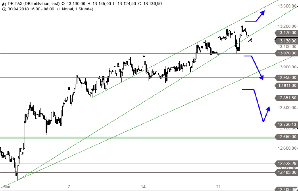 Rückblick: Nach einer schwächeren Eröffnung, die den DAX bis an die Unterstützung bei 13.070 Punkte und damit unter eine kurzfristige Aufwärtstrendlinie führte, starteten die Bullen beim DAX im Tagesverlauf einen weiteren Aufwärtsimpuls. Dieser führte den Index kurzzeitig über das bisherige Verlaufshoch und an die 13.200 Punkte-Marke. Im nachbörslichen Handel kam der DAX allerdings wieder etwas zurück und dürfte diese Korrekturbewegung heute fortsetzen.
