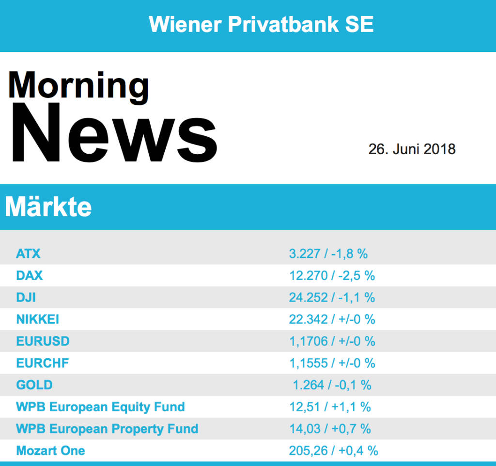 Auch in den USA kam es auf Grund der Ankündigungen des Präsidenten zu deutlich niedrigeren Notierungen, besonders betroffen waren die Technologiewerte, der Nasdaq -Index musste 2,1% tiefer schliessen. Die Standardwerte hielten sich etwas besser, der Dow Jones ging mit einem Abschlag von 1,3% aus dem Handel. Nomura strich die Kaufempfehlung für Intel , daraufhin rutschte der Titel 3,4% nach unten. Apple räumte potentielle Probleme bei den Tastaturen der neueren Macbook-Laptops ein und bietet kostenlose Reparaturen an, die Aktie hielt sich vergleichsweise gut und gab lediglich 1,5% ab. General Electric verkauft sein Geschäft mit Gasmotoren, dazu zählt auch das österreichische Unternehmen Jenbacher, an den Finanzinvestor Advent. Das bringt 3,5 Milliarden Dollar, die Papiere gaben gestern trotzdem 2,3% nach. American Express profitierte von einem positiven Gerichtsurteil in einer Anklage für einen Verstoß gegen das Wettbewerbsrecht, das Kreditkartenunternehmen konnte in dem schwachen Umfeld ein Plus von 1,3% erzielen. Campbell Soup soll laut Medienberichten von Kraft Heinz übernommen werden, daraufhin schnellte der Aktienkurs 9,4% nach oben.