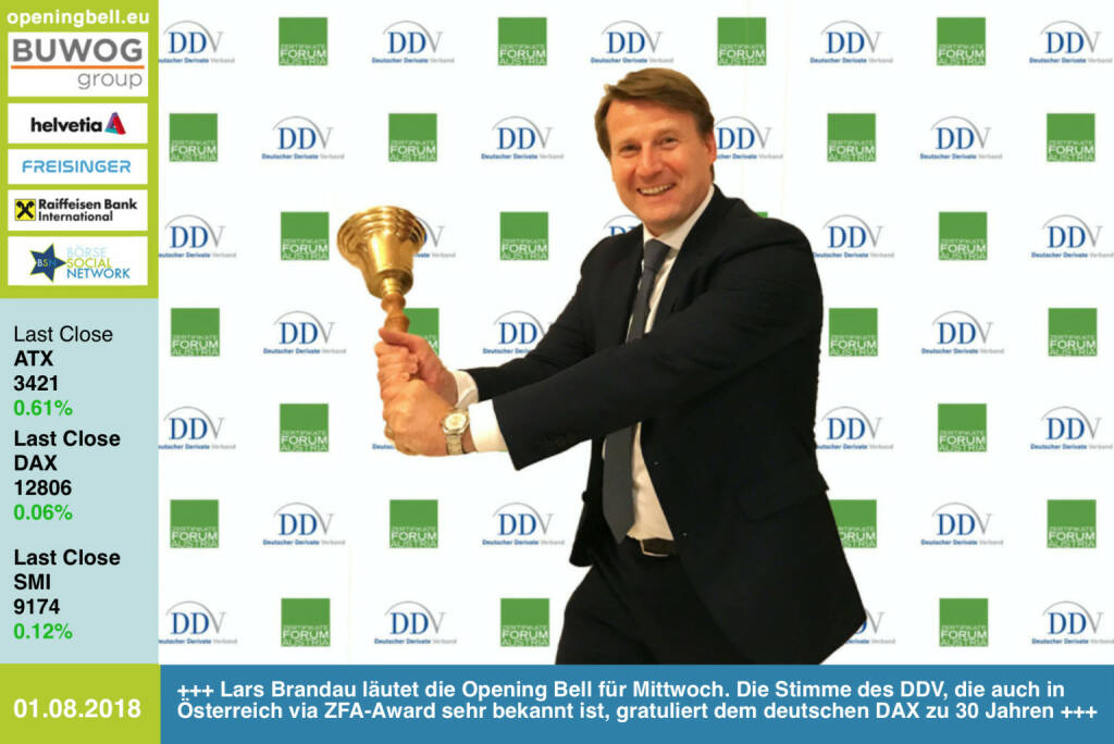 1.8.: Lars Brandau läutet die Opening Bell für Mittwoch. Die Stimme des DDV, die auch in Österreich via ZFA-Award sehr bekannt ist, gratuliert dem deutschen DAX zu 30 Jahren http://derivateverband.de #30JahreDAX https://www.facebook.com/groups/GeldanlageNetwork/ #goboersewien