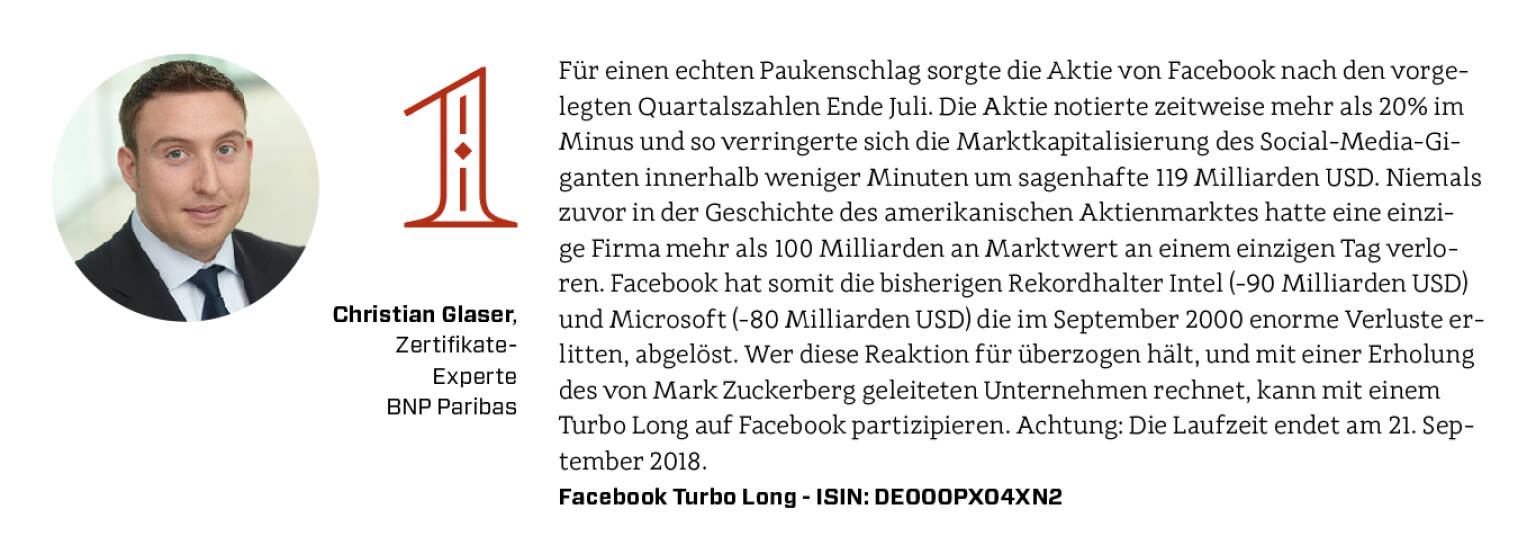 995 ZeichenFür einen echten Paukenschlag sorgte die Aktie von Facebook nach den vorgelegten Quartalszahlen Ende Juli. Die Aktie notierte zeitweise mehr als 20% im Minus und so verringerte sich die Marktkapitalisierung des Social-Media-Giganten innerhalb weniger Minuten um sagenhafte 119 Milliarden USD. Niemals zuvor in der Geschichte des amerikanischen Aktienmarktes hatte eine einzige Firma mehr als 100 Milliarden an Marktwert an einem einzigen Tag verloren. Facebook hat somit die bisherigen Rekordhalter Intel (-90 Milliarden USD) und Microsoft (-80 Milliarden USD) die im September 2000 enorme Verluste erlitten, abgelöst. Wer diese Reaktion für überzogen hält, und mit einer Erholung des von Mark Zuckerberg geleiteten Unternehmen rechnet, kann mit einem Turbo Long auf Facebook partizipieren. Achtung: Die Laufzeit endet am 21. September 2018.