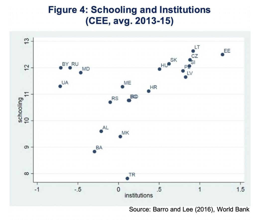 Across the CEE region most EU member states have a favorable combination of institutional quality and education. Countries in Eastern Europe like Ukraine, Russia, Belarus and Moldova perform relatively well with respect to schooling but lack institutional quality. Countries in South Eastern Europe have potential to improve the quality of institutions as well as the human capital of the work force (Figure 4).