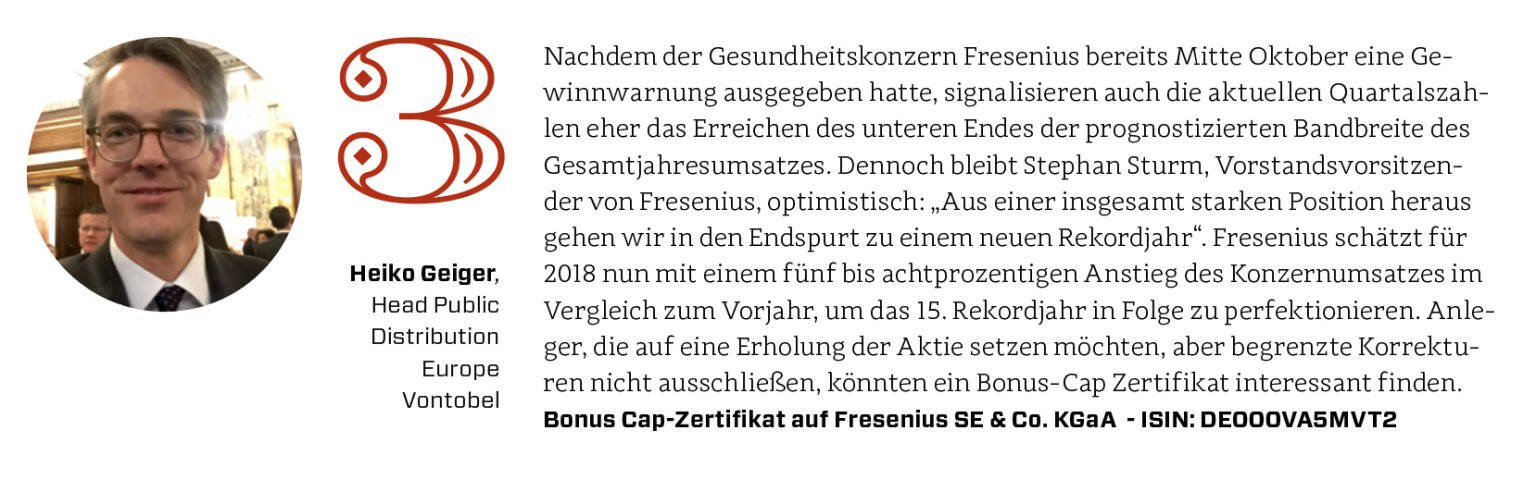 933 ZeichenNachdem der Gesundheitskonzern Fresenius bereits Mitte Oktober eine Gewinnwarnung ausgegeben hatte, signalisieren auch die aktuellen Quartalszahlen eher das Erreichen des unteren Endes der prognostizierten Bandbreite des Gesamtjahresumsatzes. Dennoch bleibt Stephan Sturm, Vorstandsvorsitzender von Fresenius, optimistisch: „Aus einer insgesamt starken Position heraus gehen wir in den Endspurt zu einem neuen Rekordjahr“. Fresenius schätzt für 2018 nun mit einem fünf bis achtprozentigen Anstieg des Konzernumsatzes im Vergleich zum Vorjahr, um das 15. Rekordjahr in Folge zu perfektionieren. Anleger, die auf eine Erholung der Aktie setzen möchten, aber begrenzte Korrekturen nicht ausschließen, könnten ein Bonus-Cap Zertifikat interessant finden.