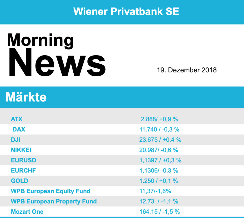 Gegen den gesamteuropäischen Trend verzeichnete der ATX einen positiven Tag und konnte 0,9% höher schliessen. Zu den größten Gewinnern zählte die Österreichische Post. Das Unternehmen trennt sich von dem Vorstand, der für die fehlgeschlagene Kooperation mit Fintech verantwortlich war, zusätzlich erreichten die Paketauslieferungen in der Vorweihnachtszeit ein Rekordhoch, dank dieser Nachrichten konnte die Aktie mehr als 3,9% anziehen. Ebenfalls zu den Gewinnern zählte Semperit , das zuletzt stark unter die Räder gekommene Unternehmen durfte sich über einen Tagesgewinn von 3,8% freuen. Und auch CA Immo war gesucht und zog um 3,7% an. Von den Schwergewichten am heimischen Markt war gestern Wienerberger der größte Gewinner, der Ziegelhersteller verzeichnete ein Tagesplus von 3,7%. Positiv endete der Tag auch für voestalpine mit einem Zuwachs von 1,0%. In der Gunst der Investoren waren auch die Bankentitel, Erste Group stieg um 2,0%, Bawag gewann 1,5% dazu, lediglich Raiffeisen erlitt einen leichten Abschlag von 0,3%. Keine klare Richtung fanden die heimischen Ölwerte, während OMV 1,6% nachgeben musste, konnte sich Schoeller-Bleckmann etwas von den Verlusten der Vortage erholen und zog um 1,4% an. Schwächer tendierten die Versorger, der Verbund schloss um 1,6% tiefer als am Vortag, bei EVN , dem einzigen positiven Wert am Montag, gab es gestern einen Abschlag von 1,5% zu verzeichnen.