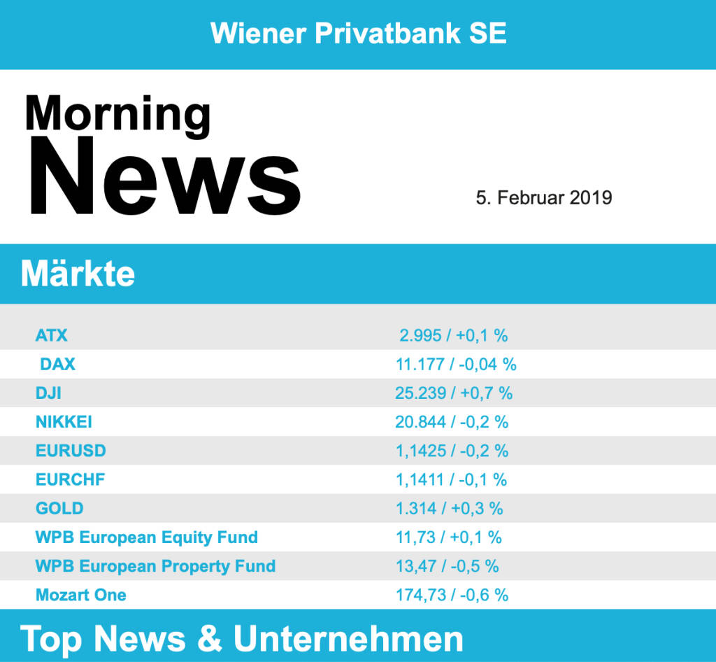 Hier erweisen sich die schwachen Zulassungszahlen im Jänner in Deutschland als Belastung, BMW , VW und Daimler verschlechterten sich zwischen 1,2% und 1,6%. An die Spitze des Branchentableaus konnten sich die Reise- und Freizeitwerte mit einem Plus von 0,8% setzen, nachlassende Ölpreise waren hier die Hauptanimation für Käufe. Eine Ausnahme in diesem Sektor bildete Ryanair , nach den eher schwachen Quartalszahlen musste der Billigflieger eine Verbilligung um 2,3% hinnehmen. Bei Panalpina hat sich der größte Aktionär des Logistikkonzerns gegen eine Übernahme durch den dänischen Konkurrenten DSV ausgesprochen, für das Schweizer Unternehmen ging es 11,7% nach Süden. Auch DSV musste 2,1% abgeben. Nichts für schwache Nerven bleibt Wirecard , nach dem Kursrutsch am Freitag ging es gestern wieder 13,7% nach oben. Ein unabhängiger Prüfer habe bis jetzt keine Anhaltspunkte auf Unregelmäßigkeiten gefunden, wurde von Konzernseite erklärt. Julius Bär enttäuschte mit dem Jahresergebnis und musste ienen Abschlag von 4,4% hinnehmen. Compugroup konnte sich mit einem optimistischen Ausblick die Aufmerksamkeit der Investoren sichern. Die Anteile des auf Arztpraxen und Apotheken spezialisierten Softwareherstellers sprangen 9,7% nach oben und profitierten dabei vor allem von deutlich erhöhten Umsatzzielen für 2019.