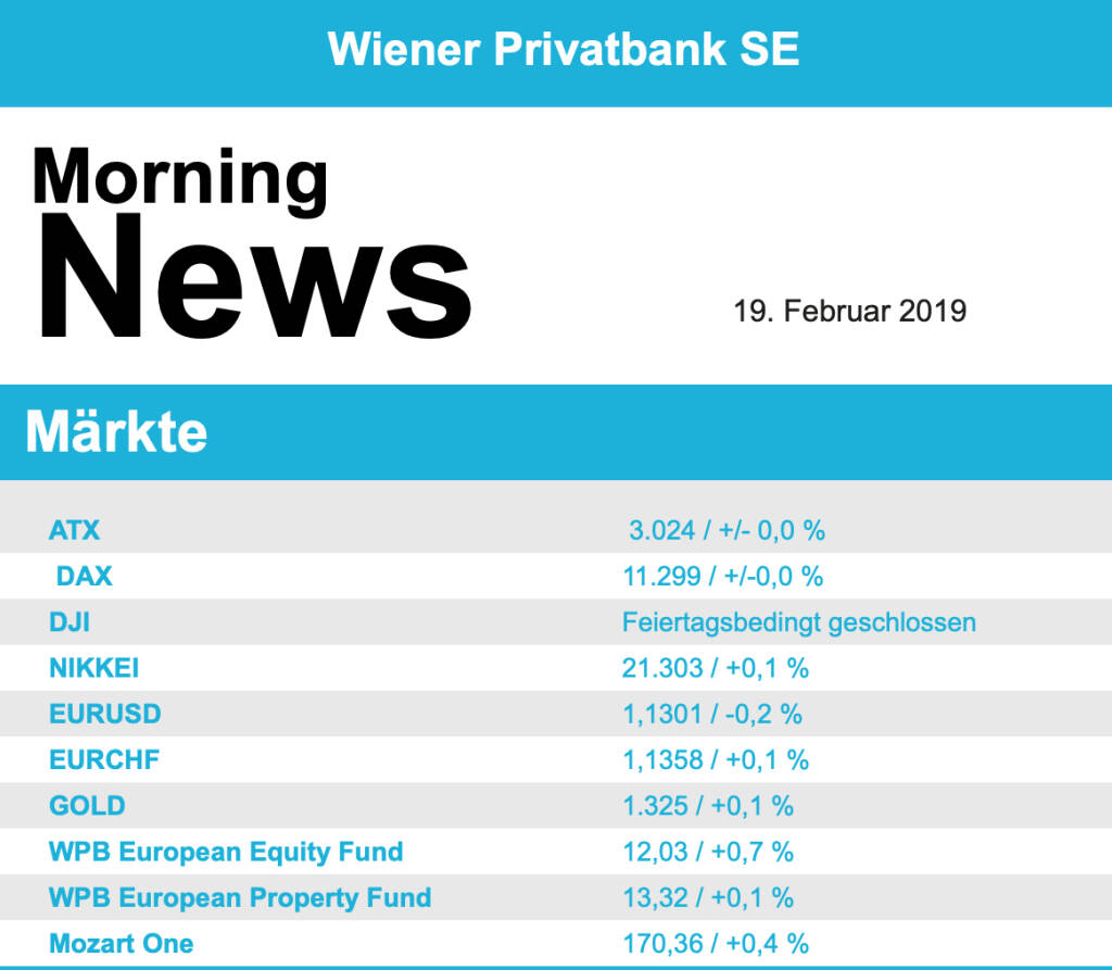 Die europäischen Börsen sind unverändert indiziert. In Asien schliessen die Märkte mit kaum nennenswerten Bewegungen. Von der Unternehmensseite berichtete bereits Bawag und Palfinger ihre Ergebnisse (siehe unten!). Makroseitig gibt es heute um 11:00 den ZEW Index.