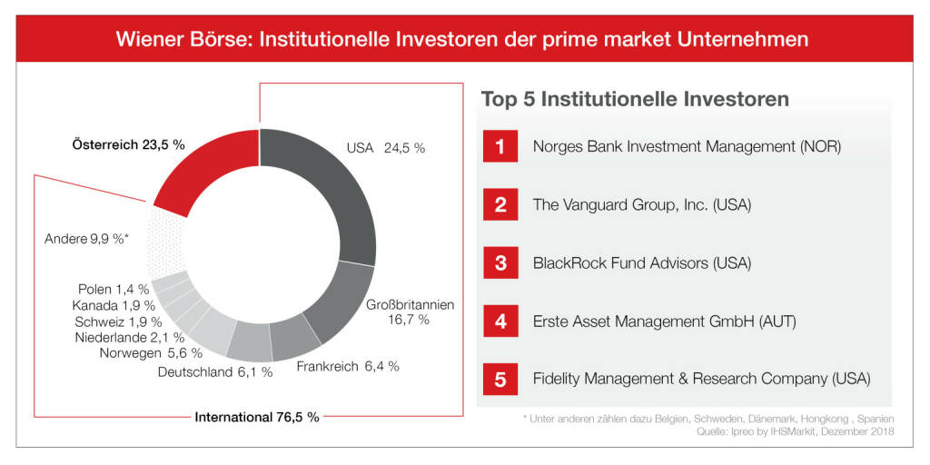 Der norwegische Staatsfonds der Norges Bank bleibt auch 2018 weiterhin der prominenteste Investor im ATX Prime . Auf Platz zwei und drei folgen die passiven amerikanischen Vermögensverwalter The Vanguard Group und BlackRock Fund Advisors.