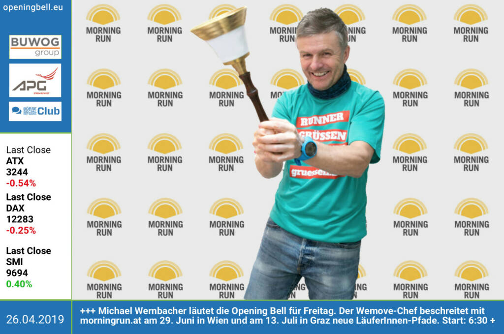 26.4.: Michael Wernbacher läutet die Opening Bell für Freitag. Der Wemove-Chef beschreitet mit http://www.morningrun.at am 29. Juni in Wien und am 13. Juli in Graz neue LäuferInnen-Pfade. Start: 6:30 Uhr http://www.wemove.at https://www.facebook.com/search/top/?q=sportsblogged http://www.runplugged.com