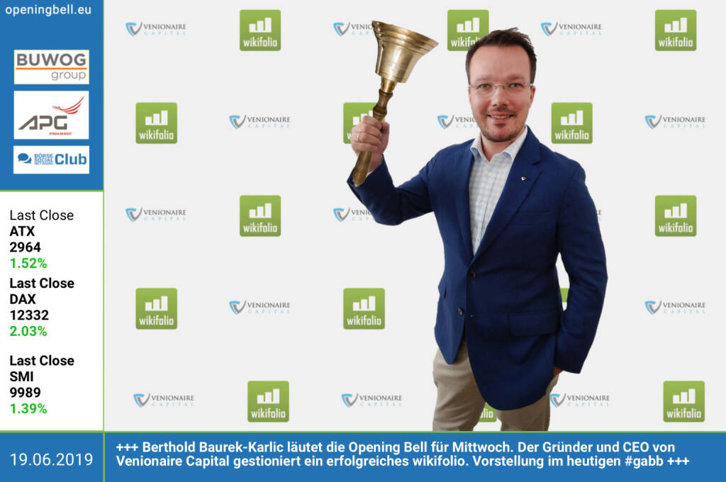 19.6.: Berthold Baurek-Karlic läutet die Opening Bell für Mittwoch. Der Gründer und CEO von Venionaire Capital gestioniert ein erfolgreiches wikifolio. Wir stellen dieses im heutigen http://www.boerse-social.com/gabb vor https://www.venionaire.com http://www.wikifolio.com https://www.facebook.com/groups/GeldanlageNetwork