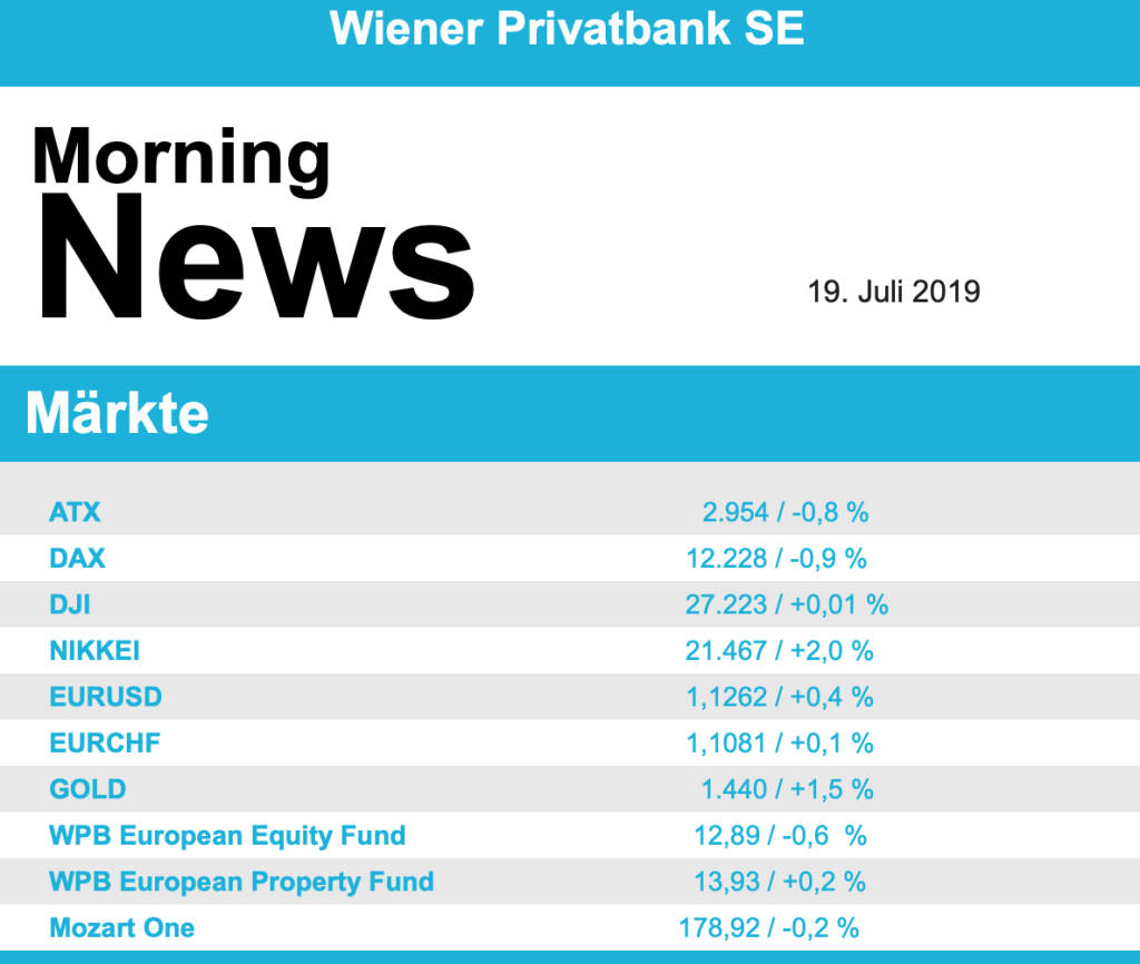 Weiter in der Abwärtsbewegung verblieben die Ölpreise, Brent schloss gestern 2,7% schwächer, WTI musste einen Abschlag von 2,6% hinnehmen. Nach wie vor hohe Lagerbestände in den USA werden als Hauptgrund für diesen Abschwung gesehen, da konnten auch erneute Spannungen mit dem Iran keine Gegenbewegung auslösen. Gold profitierte von der neu entflammten Hoffnung auf eine Lockerung der Geldpolitik in den USA und kletterte gegen Ende des Tages auf einen Wert von knapp unter 1.445 US-Dollar. Auch der Euro konnte im späten Handel gegen den US-Dollar deutlich an Boden gewinnen und erreichte einen Kurs von knapp unter 1,128.