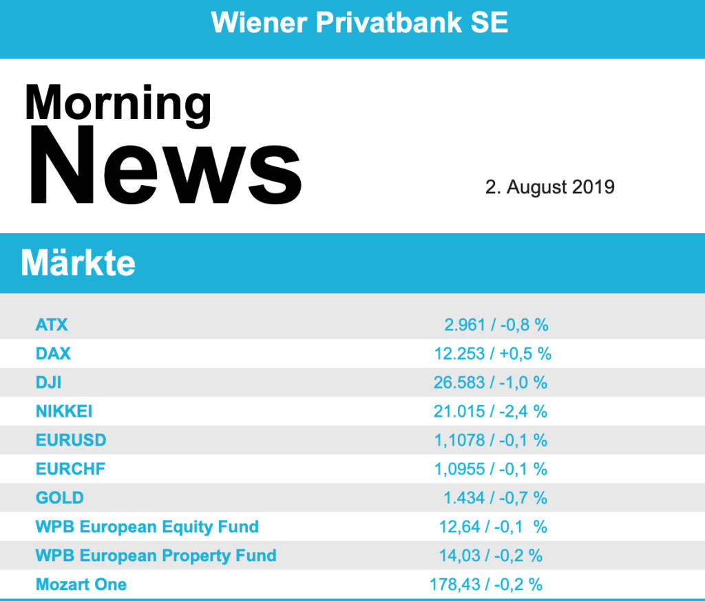 Vorbörslich sind die Börsen heute Freitag Früh in Europa aufgrund der Verluste an den US Börsen gestern deutlich schwächer indiziert. Belastet von den neuen Strafzöllen der USA gegen chinesische Güter tendierten die Märkte in Asien heute ebenfalls tiefer. Heute präsentieren Andritz und AT&S die Geschäftsergebnisse (siehe unten). Makroökonomisch steht heute in den USA der Arbeitsmarktbericht sowie die weitere Entwicklung im Handelsstreit zwischen den USA und China im Fokus der Märkte.