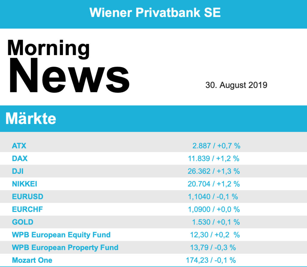 Vorbörslich sind die Märkte heute Freitag in Europa etwas freundlicher indiziert. Die asiatischen Börsen präsentieren sich heute größtenteils ebenso fester. Makroökonomisch stehen heute in Europa die Industrieproduktion in Österreich sowie das Geschäftsklima in Belgien im Fokus der Märkte. In den USA erwarten wir die Veröffentlichung der Daten zum Verkauf neuer Häuser für Juli 2019. Unternehmensseitig erwarten wir Geschäftszahlen von Marinomed und Strabag.