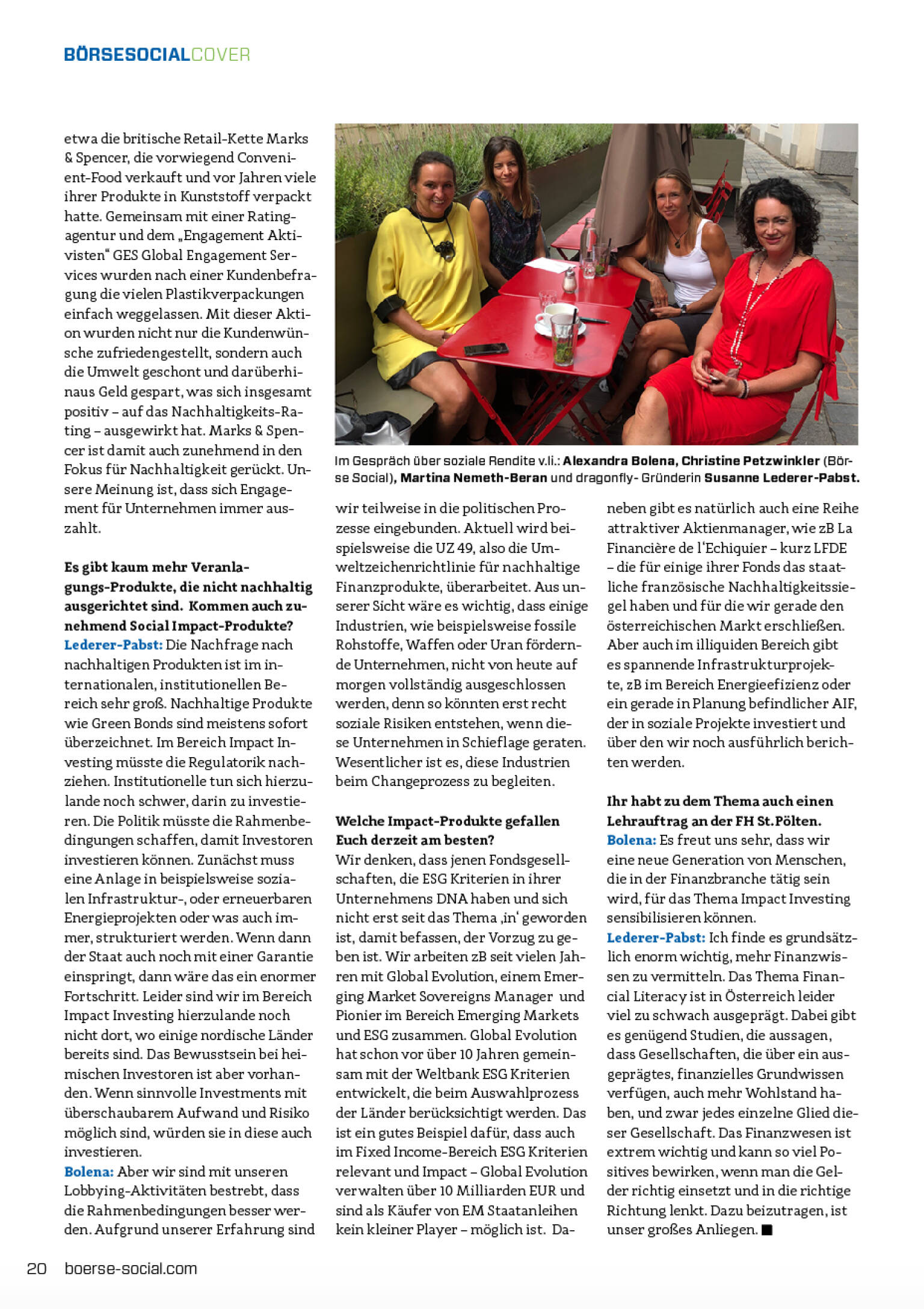 8562 ZeichenSusanne Lederer-Pabst, Alexandra Bolena und Martina Nemeth-Beran von dragonfly.finance wollen „Social Impact“ als gleichberechtigten Parameter neben Rendite und Risiko etablieren. Denn: Das wäre ein Mehrwert für uns alle.