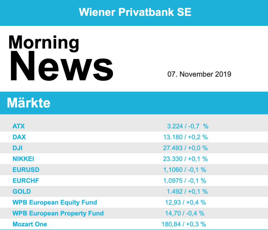 Nach den zuletzt starken Ergebnissen gab es für den heimischen Markt gestern einen kleinen Rückschlag, der ATX musste gegen das positive europäische Umfeld einen Rückgang von 0,7% hinnehmen. Impulse lieferten die Ergebnisse einiger großer Unternehmen. Der Verbund konnte zwar in den ersten drei Quartalen Umsatz und Gewinn deutlich steigern, die Erwartungen waren aber etwas höher gelegen und das brachte für den Versorger einen weiteren negativen Tag mit einem Rückgang von 3,5%. Ähnlich die Situation bei voestalpine , hier hatten die Anleger mit einem Gewinnrückgang gerechnet, das vorgelegte Ergebnis fiel aber noch etwas schwächer aus und nach den starken vorangegangenen Tagen musste der Stahlkonzern 2,0% abgeben. Ausschläge in beide Richtungen gab es nach der Vorlage der Ergebnisse bei Lenzing , die Aktien des Faserherstellers legten zeitweise zu, drehten dann aber ins Minus und schlossen 1,5% schwächer, Lenzing hat nach drei Quartalen aufgrund historischer Tiefststände bei den Viskosepreisen ein schlechteres Ergebnis als im Jahr davor verzeichnet. Wenig bewegt zeigten sich nach der Zahlenvorlage Andritz , der Anlagenbauer hatte im dritten Quartal nach Umstrukturierungskosten den erwarteten Gewinneinbruch verzeichnet, der Titel schloss nahezu unverändert mit einem kleinen Minus. Unterschiedlich verlief der Tag für die Banken, die Bawag konnte die Erholungsbewegung fortsetzen und erzielte ein Plus von 0,9%, die Erste Group musste hingegen 0,7% abgeben, auch für die Raiffeisen brachte der Tag einen kleinen Rückschlag, und zwar um 0,2%. Bester Wert des gestrigen Tages war Polytec , bei dem Autozulieferer kam mit etwas Verspätung die gute europaweite Stimmung im Sektor zum Tragen und es gab ein Plus von 3,5%. Auch Marinomed war gesucht und konnte sich gestern um 3,0% verbessern. Auf der Verliererseite war neben den schon erwähnten auch Wienerberger zu finden, der Ziegelkonzern musste 2,3% nachgeben.