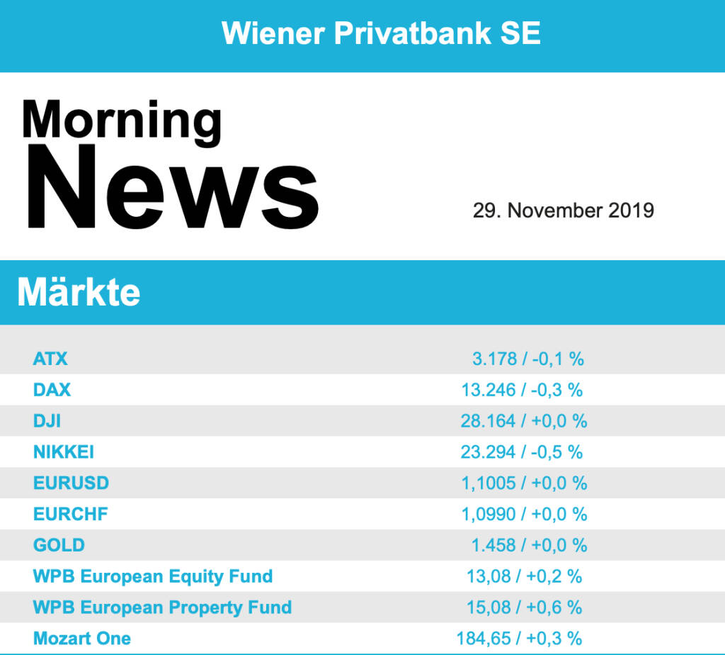 Ebenfalls leichte Kursverluste gab es in Wien, der ATX schloss angepasst an das europäische Umfeld um 0,2% schwächer. An die Spitze der Kursliste kletterte in Wien die Aktie von Schoeller-Bleckmann mit einem klaren Zuwachs von 5,0%. Der niederösterreichische Ölfeldausrüster hatte vor Handelsstart Quartalszahlen vorgelegt, die Analysten der Baader Bank bewerteten die Ergebnisse in einer ersten Einschätzung als leicht unter den Erwartungen, der Auftragseingang wurde hingegen als solide eingestuft. Auch die Immofinanz hatte Zahlen vorgelegt, die Aktie schloss mit minus 0,2% nur wenig verändert. Der Immobilienkonzern verzeichnete nach neun Monaten aufgrund von höheren Bewertungen und Mieterlösen ein kräftiges Gewinnplus. UBM -Development verlor nach präsentierten Geschäftsergebnissen ebenfalls 0,2%, der Immobilienentwickler hat in den ersten drei Quartalen nach Immobilienverkäufen ebenfalls ein starkes Gewinnplus erzielt. Porr lieferte wie erwartet schwache Ergebnisse, nach den deutlichen Abgaben, die der Baukonzern diese Woche bereits erleiden musste, ging es gestern um weitere 4,8% nach unten. Lenzing litt unter einer Abstufung durch die Baader Bank, die Empfehlung für den Faserkonzern wurde von „Buy“ auf „Hold“ reduziert was in einem Tagesminus von 1,7% resultierte, das Kursziel wurde ebenfalls gesenkt. Andritz musste ein weiteres Absinken des Kurses um 1,6% hinnehmen, Analysten hatten den gestrigen Gewinnausblick des Unternehmens auf das Jahr 2020 als unter den Erwartungen bewertet. Zulegen konnte Agrana , für den Zuckerkonzern brachte der gestrige Tag einen Anstieg von 2,7%. Ebenfalls gesucht war Rosenbauer , der Feuerwehrausstatter konnte sich um 2,4% befestigen. Gleichfalls stark waren die beiden Immobilienkonzerne Warimpex und CA Immo mit Anstiegen von 1,9% beziehungsweise 1,6%. Auch Polytec stand auf den Einkaufslisten der Investoren, der Autozulieferer erreichte einen Tagesanstieg von 1,7%.